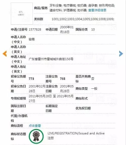 这枚商标的持有人是广州一家医疗器械公司的老板,在医疗器械行业摸爬滚打了数年,在1999年创立了名为“持久”的性用品专卖店并花费3000元注册了“持久”的商标。虽然后来改行了,不过这枚商标一直在他手里。